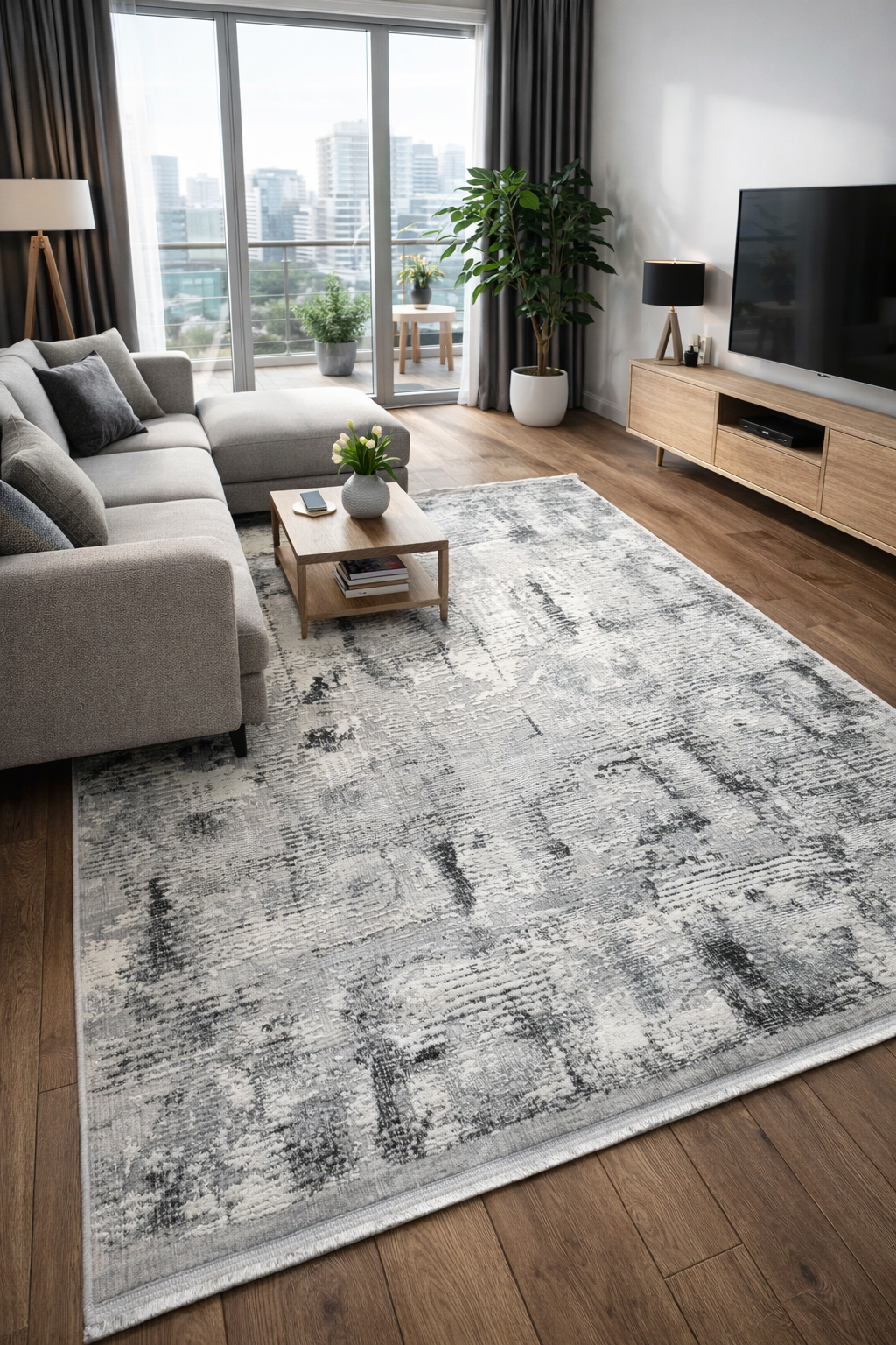 Transformă-ți livingul într-un spațiu sofisticat cu acest covor modern în nuanțe de gri. Designul abstract, cu accente texturate lucioase, adaugă profunzime și rafinament oricărui interior, fie că vorbim de un decor clasic sau contemporan. Fabricat din materiale de înaltă calitate, este moale la atingere, ușor de întreținut și ideal pentru zonele de trafic intens.