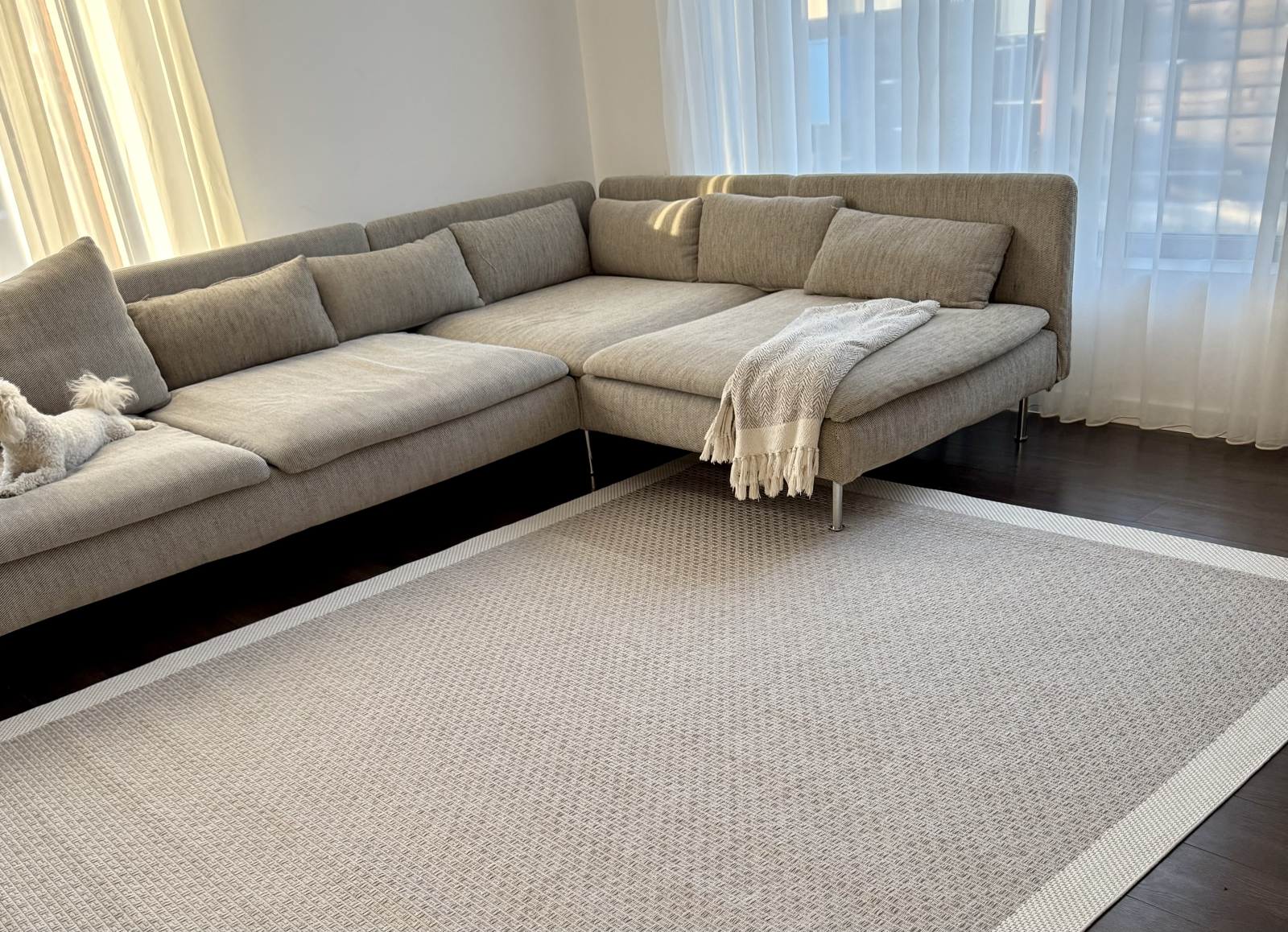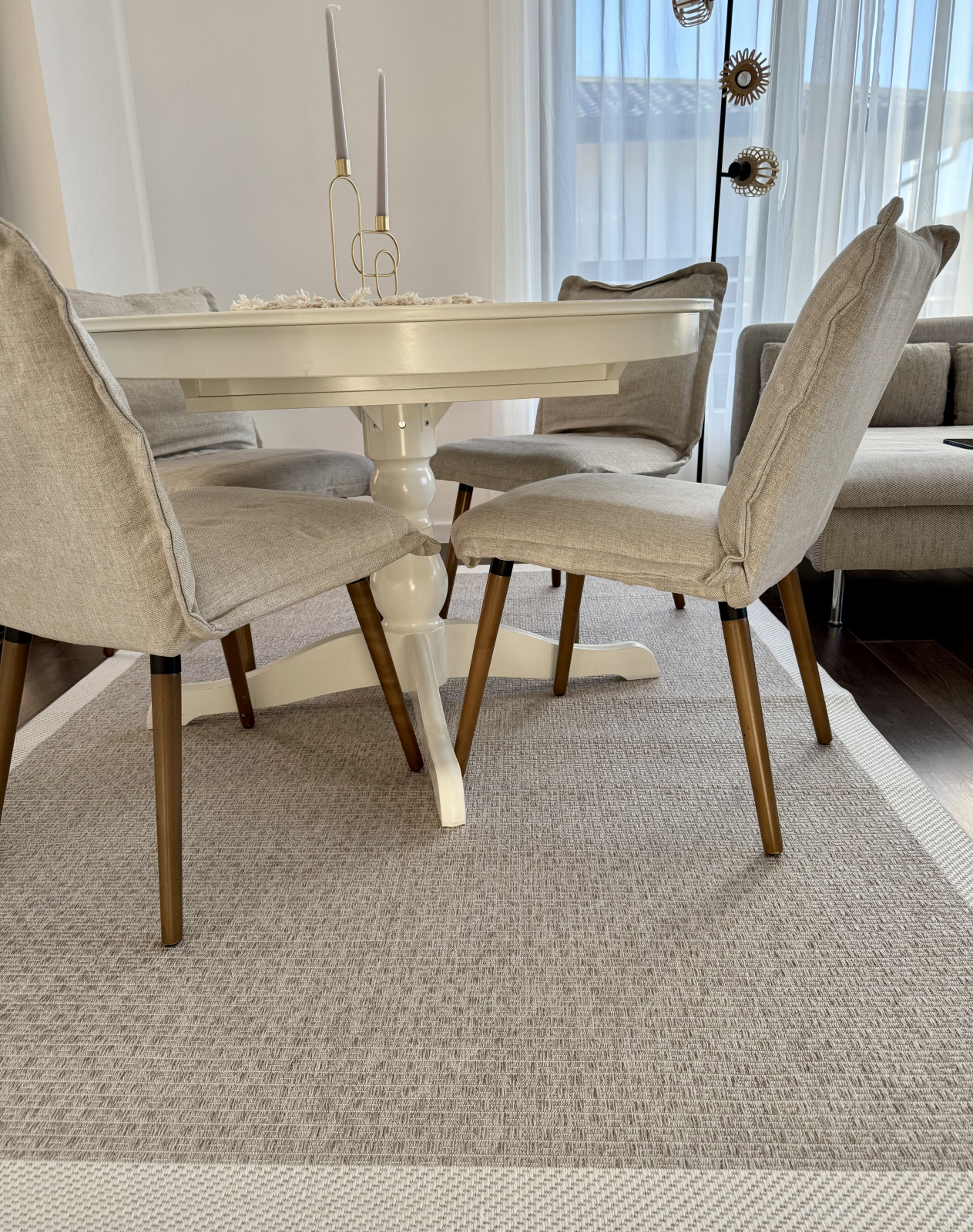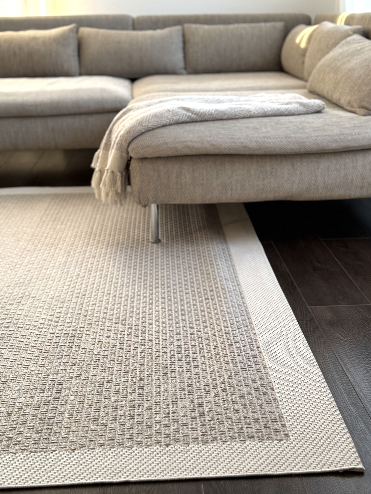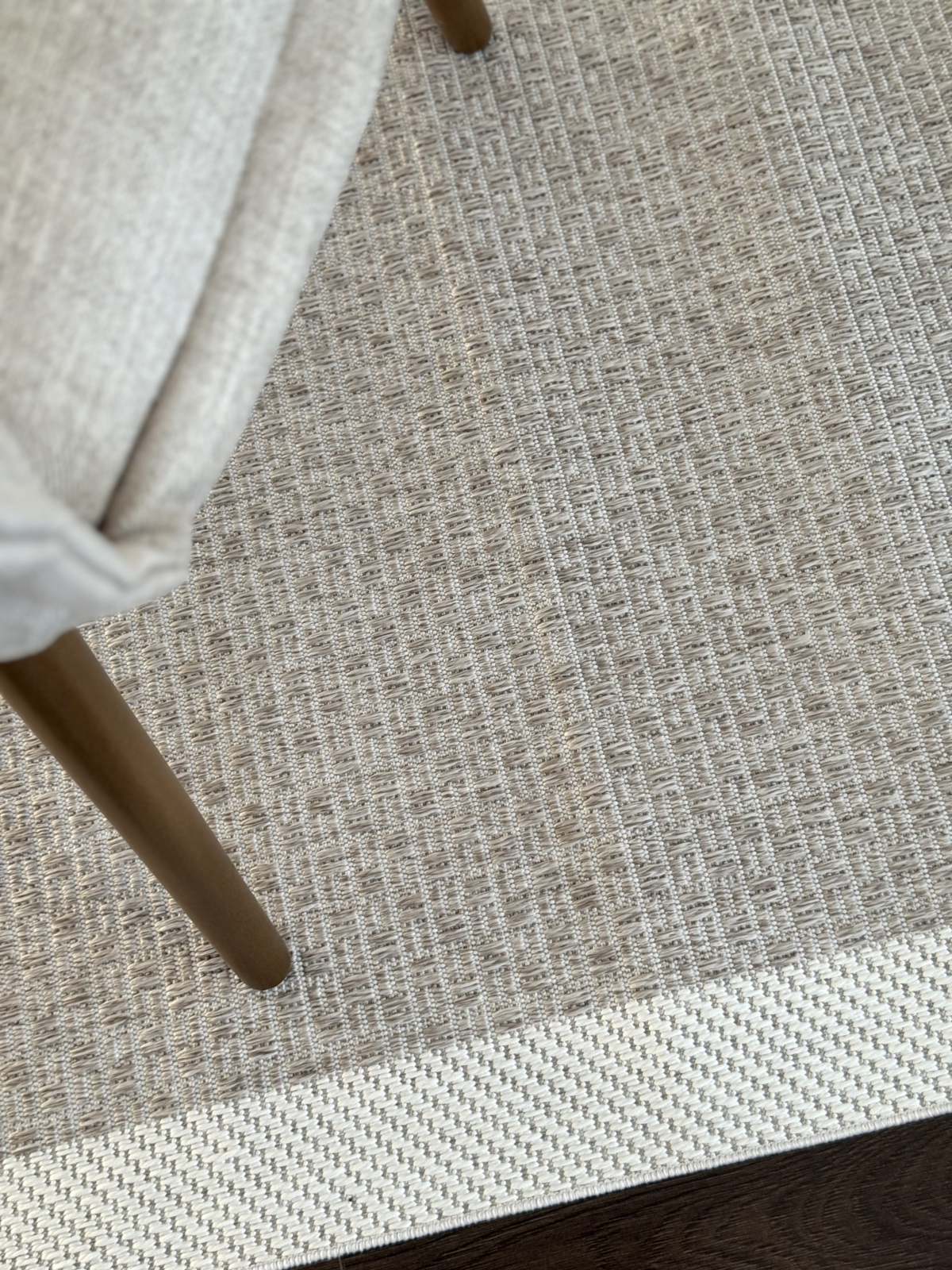 Covor modern, cu textură împletită și margini contrastante, ideal pentru spații rezidențiale sau comerciale. Culorile predominante sunt bej - maro si alb, completate de tonuri neutre care îi oferă un aspect elegant și ușor de integrat în diverse stiluri de amenajare. Suprafața este practică, rezistentă și are finisaj antiderapant, pentru siguranță la utilizare.