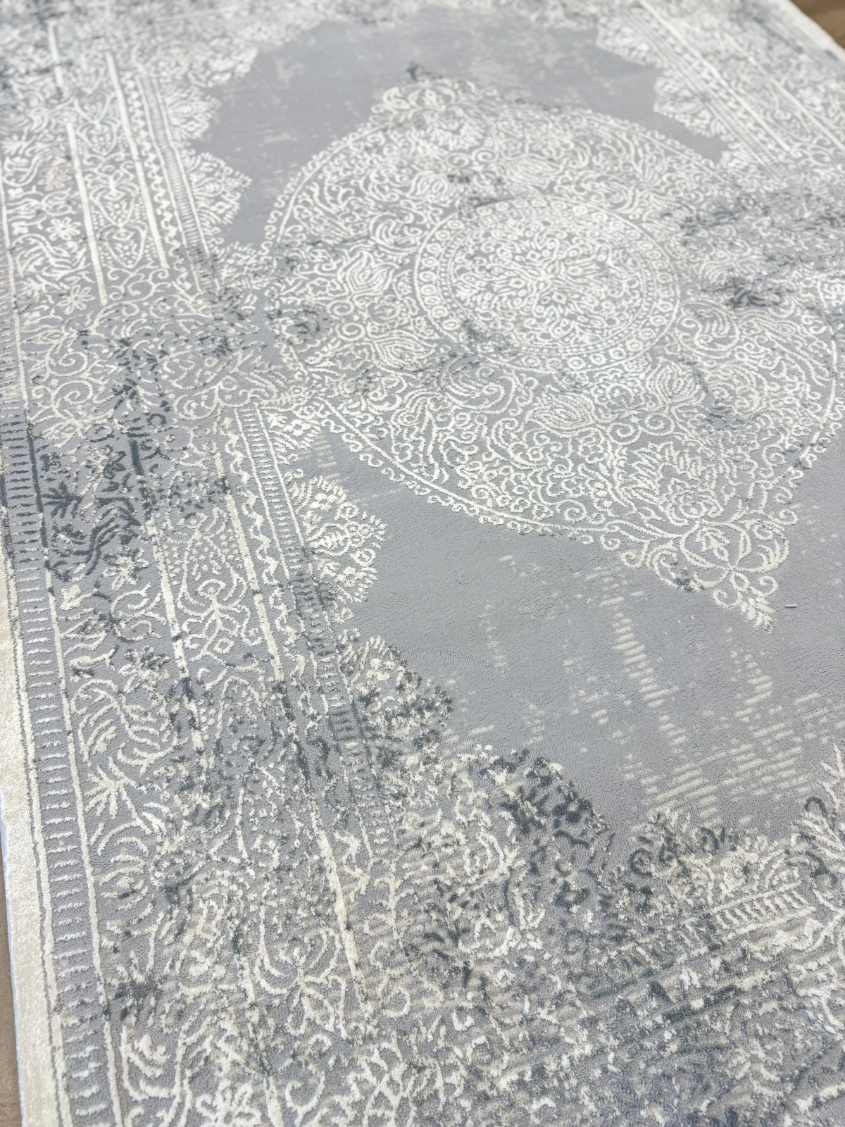 Acest covor clasic gri cu accente de alb impresionează prin modelul său ornamental de inspirație barocă, care adaugă rafinament și eleganță oricărei încăperi. Tonurile calde și luminoase de gri creează o atmosferă primitoare, ușor de integrat în diverse stiluri de design interior – de la clasic și vintage, până la modern și contemporan.